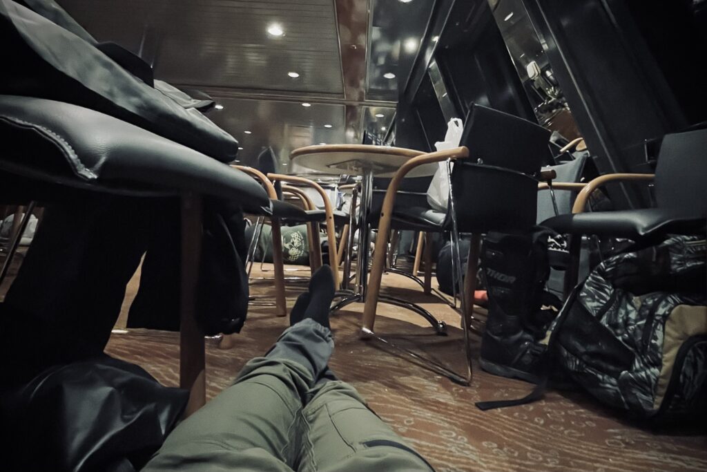 Hours were passing by slowly and then the final thing keeping us going gave out: the intercoms. The plan was to charge everything in the cabins of our ferry, but as we couldn’t, we had to power through.