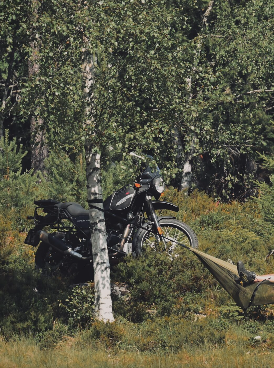 The Motorcycle: Raven (our black Royal Enfield Himalayan 411), a rugged and nimble explorer built to handle the shifting terrain of a Norwegian spring.